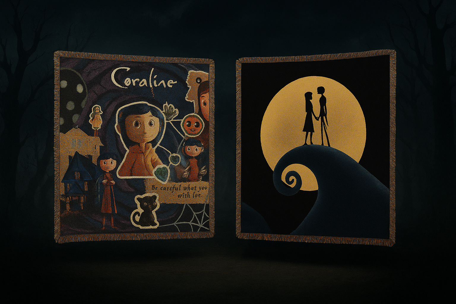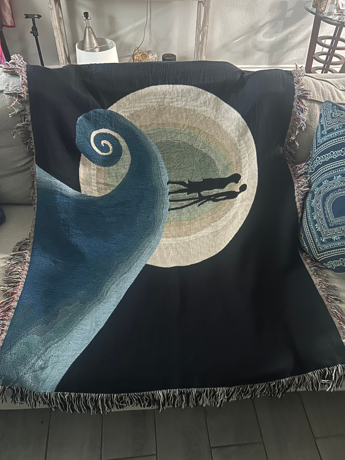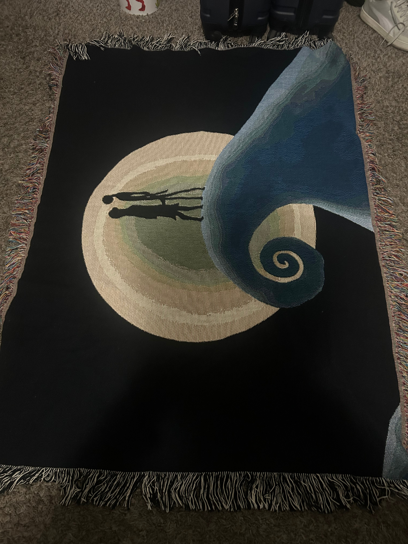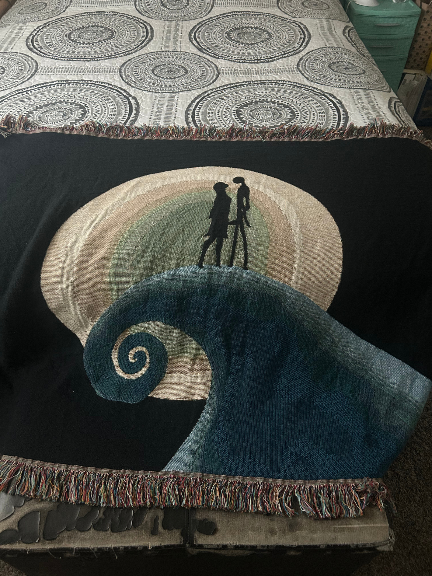 Absolutely obsessed with this blanket! The hand-woven texture feels so cozy and the Tim Burton-inspired design gives my room such a unique vibe.